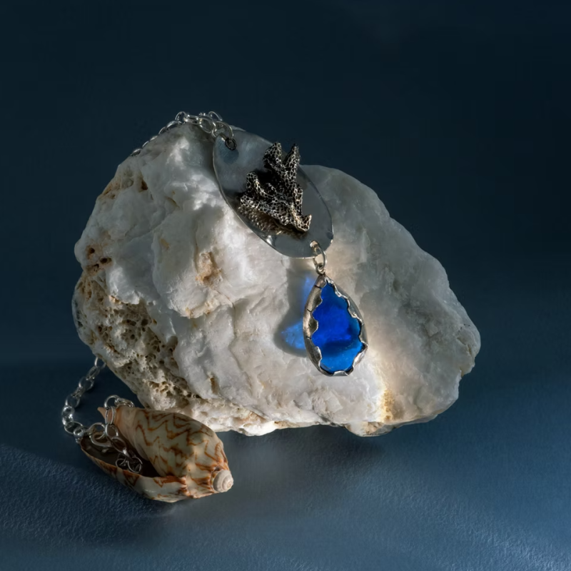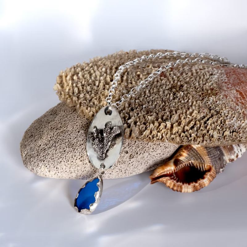 Handcrafted from 925 silver, this unique necklace features a pendant of ultramarine glass and natural coral. Inspired by Calypso, the sea nymph from Greek mythology — a symbol of mystery, independence, and quiet strength.According to myth, Calypso lived on the island of Ogygia and kept Odysseus by her side for years, offering him shelter and peace. Her name is linked to the hidden and the unexplored — much like the silent pull of the sea itself.